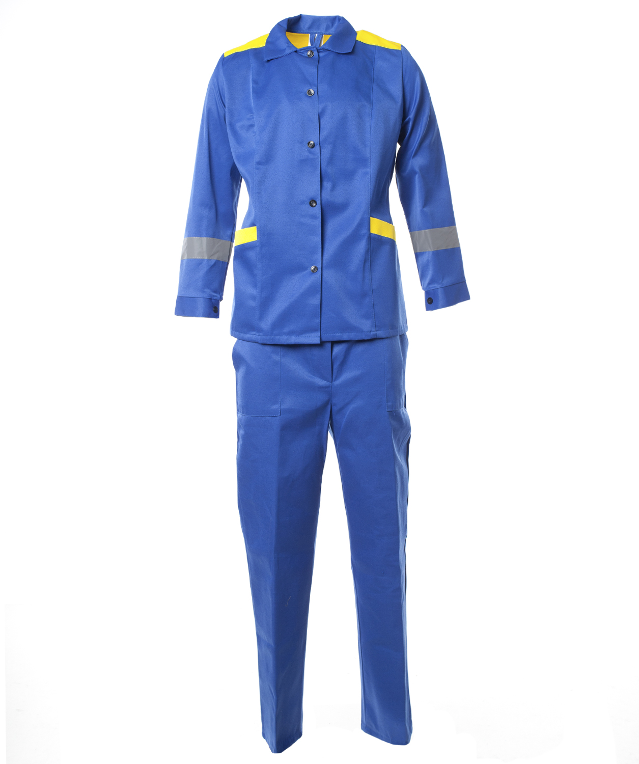 Костюм «ДЮЙМОВОЧКА» с СОП женский Цвет: васильковый с желтым Ткань: «Грета» смесовая (80% ПЭ, 20% ХБ, пл. 200±10 гр/м2, ВО) Размер / рост: с 88-92 по 120-124 / 170-176, 182-188 ГОСТ 12.4.280-2014, ТР ТС 019/2011 -куртка с застежкой на пуговицы -нижние накладные карманы с наклонным входом -рукава с манжетами на пуговицах по низу -регулировка ширины спинки куртки на эластичную резинку -брюки с накладными карманами с наклонным входом -застежка гульфика на пуговицы-притачной пояс на пуговице -частичная стяжка по бокам на эластичную резинку -в костюме используется светоотражающая полоса 50 мм