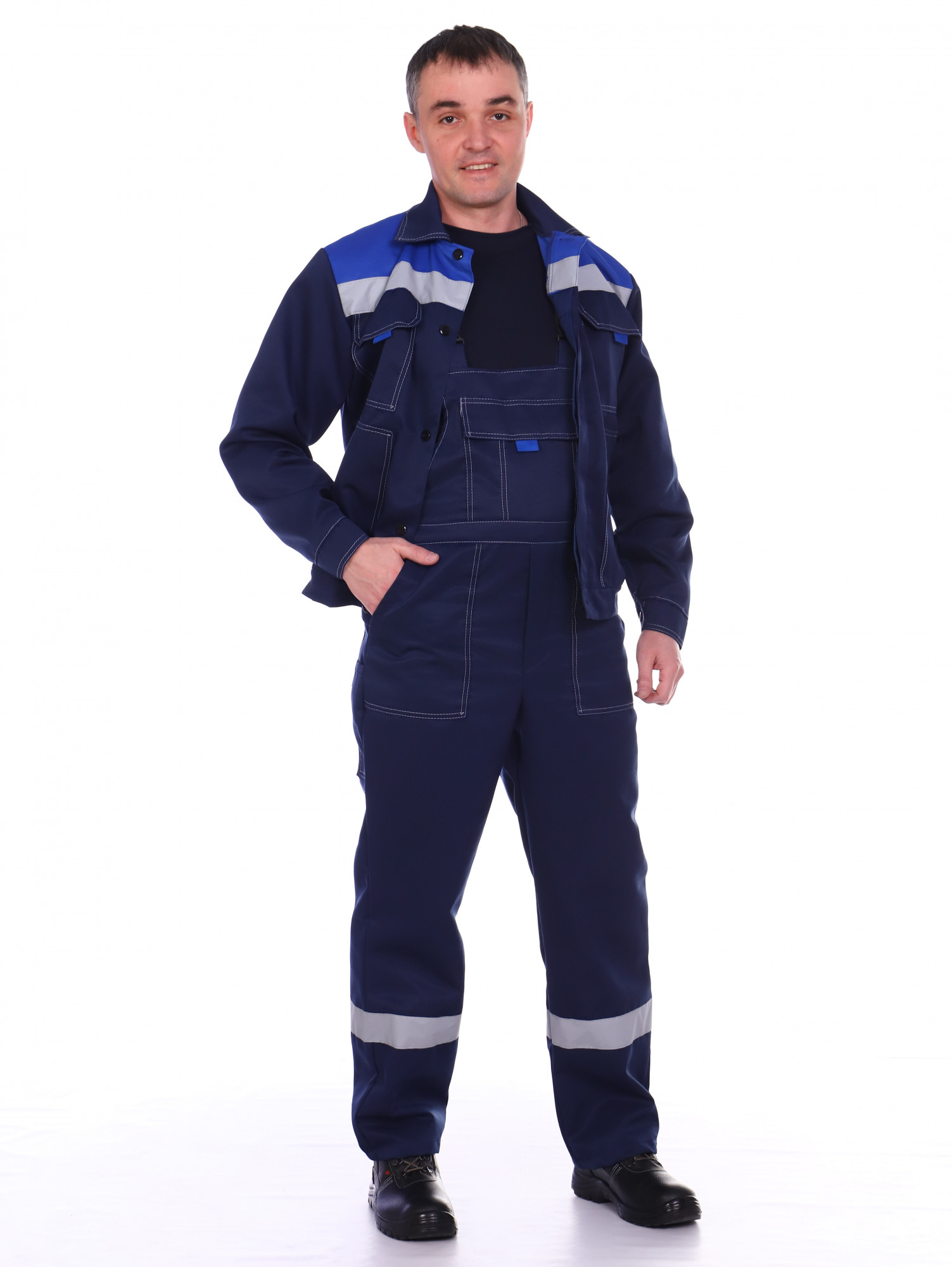 Куртка укороченная на поясе с супатной застежкой на пуговицы. Полочки и спинка на кокетках контрастного цвета. Сверху два накладных кармана на клапанах, снизу два накладных с "косым" входом. По кокетке в круговую проходит СОП 50 мм.Полукомбинезон с боковыми накладными карманами и накладным нагрудным карманом с клапаном. Цвет: темно-синий с васильком (возможен вариант изготовления с любыми цветами) Ткань: смесовая ХБ/ПЭ пл. 210 г/м Свойства: З Ми Ву