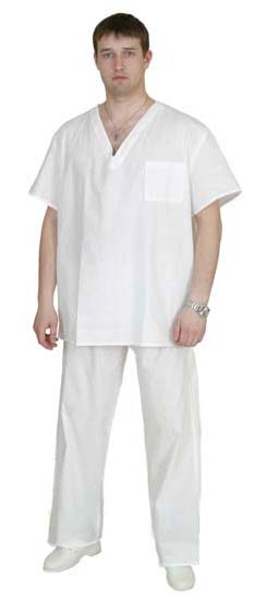 Универсальная модель, рекомендуется для женщин и мужчин. Блуза с v–образным вырезом горловины, накладными карманами, коротким рукавом. Брюки прямого покроя. ГОСТ 9897–88 Цвет: белый Ткань: бязь, 100%–хлопок, пл. 142 г/м? Размер: с 44–46 по 60–62 Рост: 170–176, 182–188