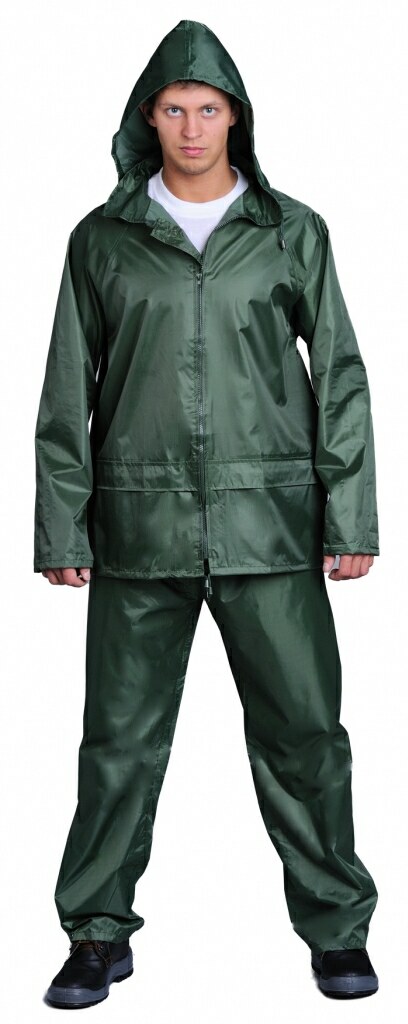 Костюм состоит из куртки и брюк. Куртка на застёжке–молнии и планкой на кнопках, съёмным капюшоном, накладными карманами с клапанами. Рукава–реглан имеют внутренний манжет на эластичной ленте. Возможна регулировка ширины брюк при помощи кнопок. Цвет: зеленый Ткань верха: Нейлон с ПВХ Размер: с 44-46 по 60-62 Рост: 170-176, 182-188