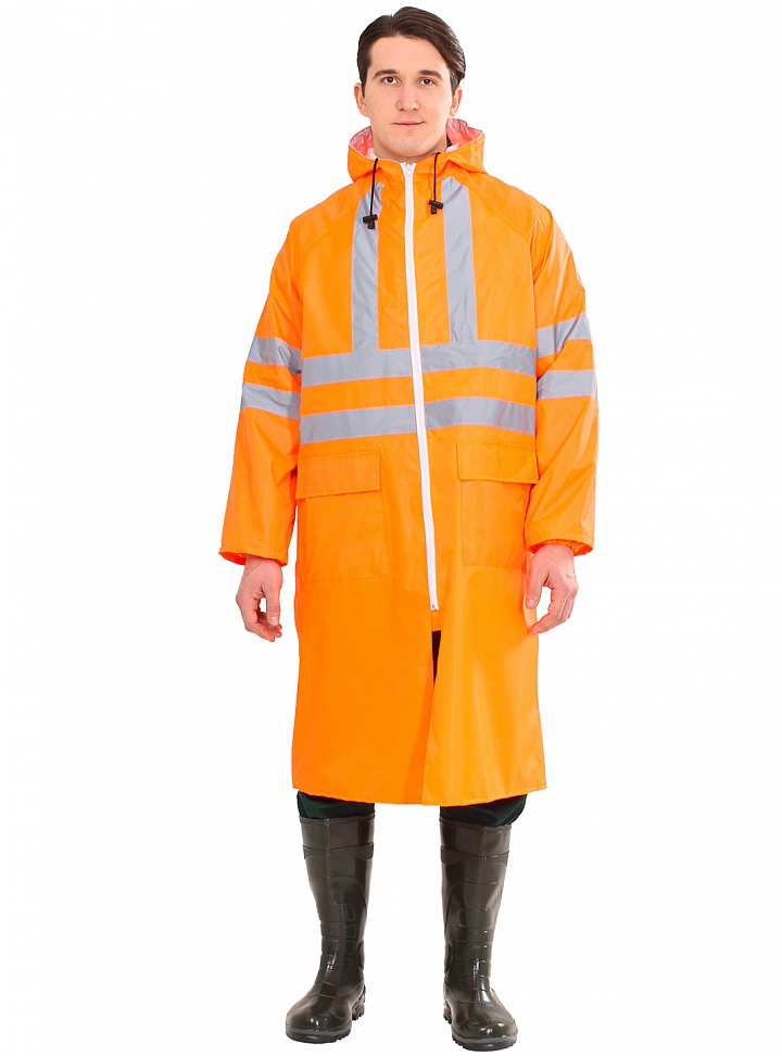 Плащ специальный для защиты от воды со светоотражающими элементами на застежке молнии. Капюшон плаща регулируется шнурком кулиска. Воротник отложной с дополнительным карманом на молнии для капюшона. Рукава прямые с дополнительными манжетными резинками. Боковые карманы с дополнительным верхним клапаном. Также, на торсе и спине по 4 светоотражающие полосы и по 2 светоотражающие полосы на рукавах. Швы прошиты нитками, дополнительно проклеены резиновой лентой с внутренней стороны изделия. Материал: основа — нейлон (плотность 190 мкр); водоотталкивающее покрытие — ПВХ. Показатель водоупорности материала: 1834 Па