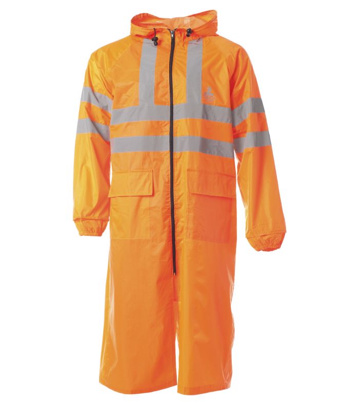 Плащ специальный для защиты от воды со светоотражающими элементами на застежке молнии. Капюшон плаща регулируется шнурком кулиска. Воротник отложной с дополнительным карманом на молнии для капюшона. Рукава прямые с дополнительными манжетными резинками. Боковые карманы с дополнительным верхним клапаном. Также, на торсе и спине по 4 светоотражающие полосы и по 2 светоотражающие полосы на рукавах. Швы прошиты нитками, дополнительно проклеены резиновой лентой с внутренней стороны изделия. Материал: основа — нейлон (плотность 190 мкр); водоотталкивающее покрытие — ПВХ. Размер: с 44-46 по 60-62 Рост: 170-176,182-188 ГОСТ: ГОСТ Р 12.4.219-99