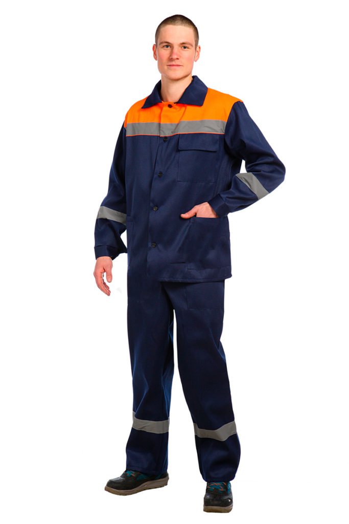 Костюм куртка+брюки Куртка прямая с 2-мя накладными карманами снизу и одним верхним на клапане,рукава на манжете.усиления в области локтей.СОП 5 см проходит по кокетке и низу рукавов.Брюки прямые на поясе со шлевками,2 накладных кармана по бокам,усиления в области колен,СОП 5 см по низу брючин. Ткань смесовая 35% хлопок,65% полиэстер,пл. 210 г\м Цвет: синий+оранжевый