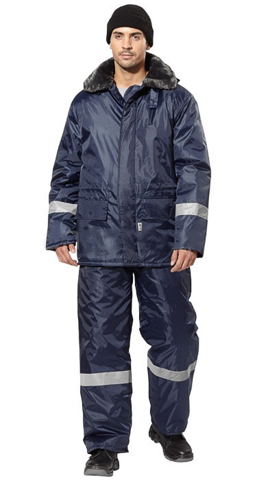 Куртка прямая с застежкой на пуговицы,2 нижних накладных кармана,меховой воротник,утепленный капюшон,СОП 5 см по груди и спине,полукомбинезон на молниии высокий с двумя накладными и одним нагрудным карманом на фастексах,СОП 5 см снизу по штанинам. Ткань верха: оксфорд синий 100% п\э ВО Подкладка : тафета 100% п\э утеплитель: куртка 360 г\м синтепон,полукомбез 240 г\м