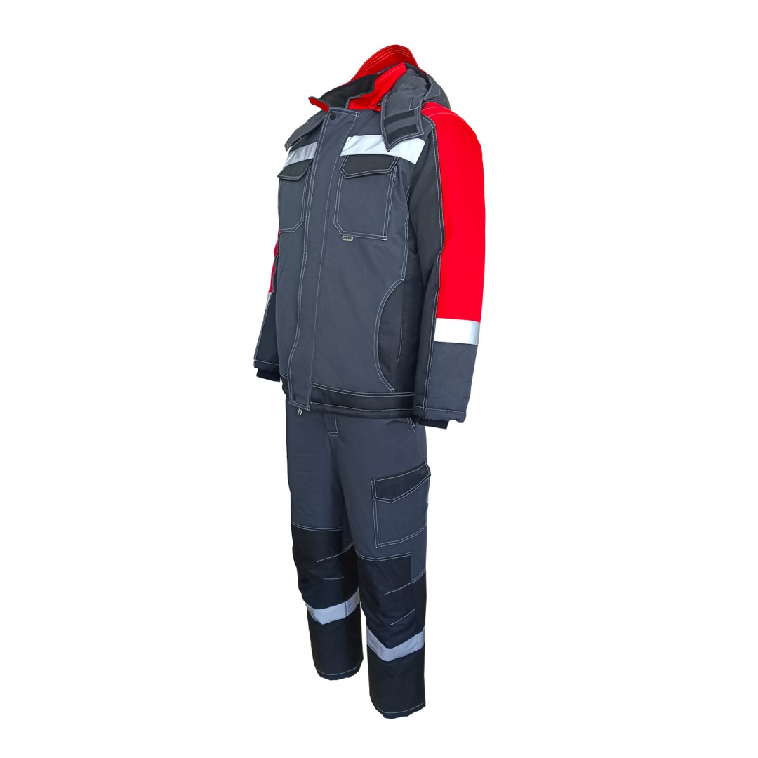 Характеристики: Комплект поставки: Куртка, Полукомбинезон Ткань верха: «NORDIKA» полиэфир ТПУ мембрана Ткань подкладочная: Ткань подкладочная + фольгированная подкладка: состав: 100% ПЭ Утеплитель: 100% ПЭ - 150г/м, в куртке 450 г/м (3 слоя в корпусе, 2 слоя в рукавах), брюки - 200 г/м Класс защиты: 4 класс защиты от пониженных температур Климатический пояс: Особый климатический пояс Центральная застежка: на молнию трактор №8 - 2 замка «Акулий зуб» (звено серебро) Состав: 100% ПЭ, пл. 170 г/кв.м. Цвет: т. серый / черный / красный ГОСТ: 12.4.303-2016 ТР ТС 019/2011 Куртка: • с центральной застежкой на молнию, закрытую ветроза- щитной планкой на липучку и кнопками с пластиковой шляпкой • с нагрудными накладными карманами с объёмом и фигурными клапанами на липучку • нижними прорезными карманами на тесьму «молния» в рельефных швах • с внутренним накладным карманом на тесьму «молния» и карманом для документов из полотна «Сетка» • съёмный капюшон с регулировкой объёма по лицевой и затылочной части и возможностью использования капюшона на каску • трикотажные манжеты по низу рукавов • с фигурной линией низа по спинке Полукомбинезон: • с центральной застежкой на тесьму-«молния» • с нагрудными накладными карманами с объёмом и фигурным клапаном на липучку • с внутренними карманами на передних половинках • с накладным карманом с объёмом и фигурным клапаном на липучки • Анатомический крой колена • В области колена дополнительный объем и подрез на задних половинках для удобства • в костюме используется световозвращающия лента 50 мм • внизу боковых швов застёжка на тесьму-молнию и клапан на кнопках