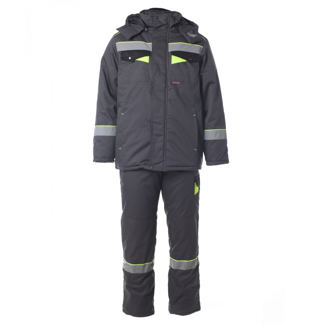 Костюм утепленный Корвет с СОП темно-серый с лимонной отделкой. Ткань верха: смесовая «Орион», состав: 65% ПЭ, 35% ХБ, пл. 210гр/м2, ВО отделка Утеплитель: полотно высокоизвилистое, силиконизированное "Аляска"-150 гр/м2. Куртка: 450 гр/м2 (3 слоя корпус, 2 рукава). Брюки: 300 гр/м2 (2 слоя) Подкладочная ткань: "Тафета 190", состав: 100% ПЭ, пл. 55±10 гр/м2 - центральная застежка на молнию металл №5 - ветрозащитная планка с застежкой на липучки и кнопки - нагрудные накладные карманы и карманы в рельефных швах полочек - регулировка ширины изделия по низу - рукава с внутренними трикотажными манжетами - капюшон утепленный, съемный с козырьком - брюки с широким утепленным поясом с застежкой на пуговицы - съемные бретели с регулировкой - брюки с различными многофункциональными карманами - гульфик на молнии - усилительные накладки в области коленей - яркие декоративные элементы - в костюме используется светоотражающая лента 50 мм
