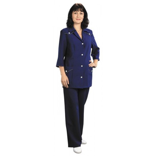 Удлинённый жакет с центральной застёжкой на пуговицы, с рельефами, отложным воротником с лацканом. Кокетка и обтачка накладного кармана фигурной формы. В качестве отделки используется контрастный кант. ГОСТ 25294–2003 Цвет: тёмно–синий Ткань: смесо-вая, 65%-п/э, 35%-х/б, пл. 130 г/м? Размер: с 44–46 по 60–62 Рост: 158–164, 170–176