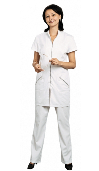 Стильная модель. Используется фурнитура с серебряным блеском. Удлиненная блуза с центральной застёжкой на молнию, воротником–«стойка». Полочка с рельефами. Возможен заказ модели укороченного халата. ГОСТ 9896–88 Цвет: белый Ткань: «Оптима», 65%–п/э, 35%–х/б, пл. 160 г/м2 Размер: с 40–42 по 60–62 Рост: 158–164, 170–176