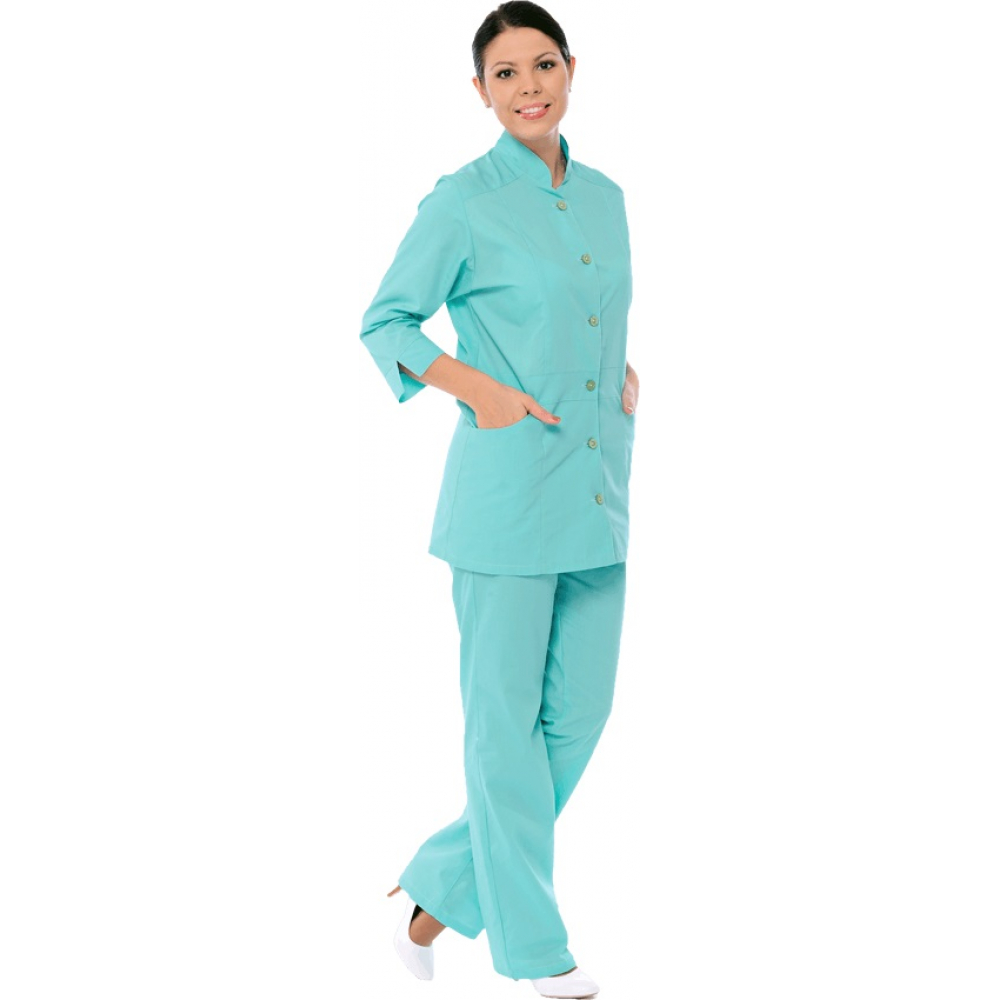 Цвет: светло-зелёный Ткань: «Тиси» Состав: 65% полиэфир, 35% хлопок, пл. 120 г/м² Костюм состоит из блузы и брюк. Блуза: • полуприлегающий силуэт • центральная бортовая застёжка на пуговицы • с рельефами на полочках и спинке • воротник-стойка • боковые карманы • рукава укороченные, с манжетами Брюки: • прямые • пояс с эластичной лентой