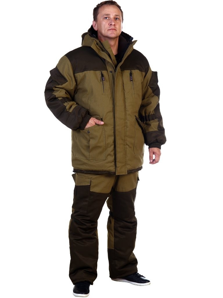 Костюм зимний "Шторм (палатка хаки)" состоит из куртки и брюк. Куртка прямого силуэта, удлиненная, с застёжкой на молнию, с двумя ветрозащитными планками и капюшоном с регулировкой. Полочки с кокетками, с верхними прорезными карманами в рамке с молниями, два накладных кармана. Спинка цельнокроеная с кокеткой. Сбоку, по линии талии, утяжка эластичной лентой. Рукава втачные, с усилителями внизу рукава и локтевой части, с накладными карманами с клапаном. Манжеты притачные на резинке. Низ куртки с утягивающим шнурком. Брюки анатомического кроя, с широким притачным поясом на резинке, с отстегивающимися регулируемыми подтяжками. На брюках два боковых и два объемных кармана. Двойные отделочные строчки. Ткань основы 100%хб (палаточное полотно) Ткань отделки смесовая 20хб/80пэ Утеплитель синтепон Подклад 100%пэ