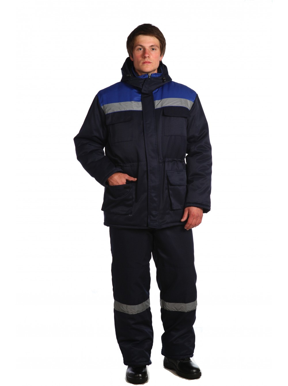 Костюм состоит из куртки и полукомбинезона. Куртка прямая с ветрозащитной планкой, 4-мя накладными карманами на клапанах застегивающиеся при помощи контактной ленты, спинка и полочки на кокетках из ткани отделочного цвета, утепленный капюшон с регулировкой и застежкой на контактную ленту, рукава с трикотажными манжетами, объем по линии талии регулируется при помощи кулисы, СОП 50мм по линии кокетки. Полукомбинезон с центральной застежкой на молнию, накладными карманами, по спине регулировка объема при помощи эластичной тесьмы, по низу брюк расположен СОП 50мм. Ткань: смесовая 35% х\б, 65% п\э. Утеплитель: синтепон - куртка 360 г/м2, полукомбинезон 240 г\м2 Цвет: т. синий с васильком