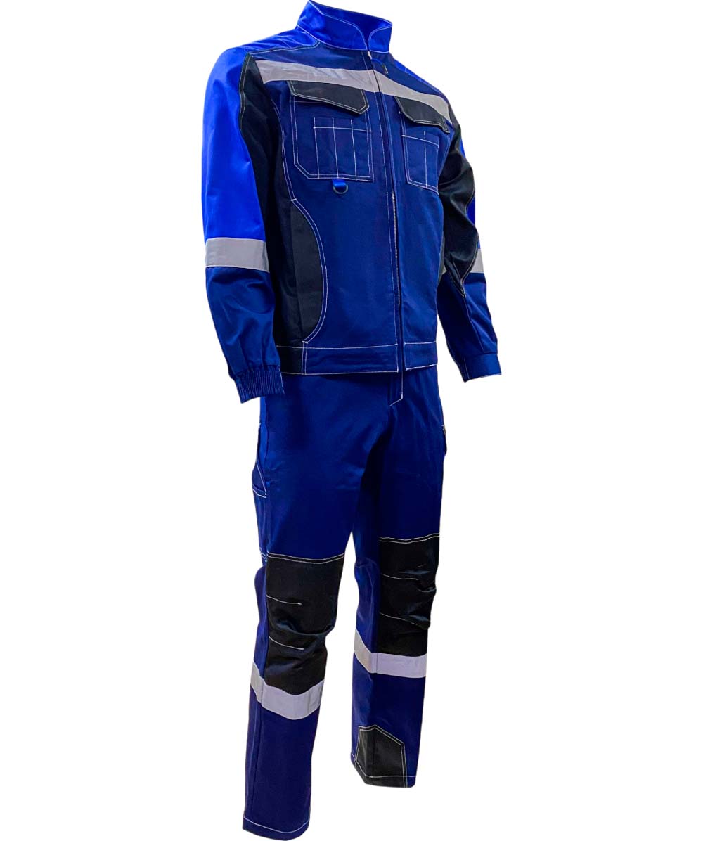 Костюм "ФОРМУЛА" с СОП куртка, полукомбинезон, цв. т.синий, чёрный, василёк -ткань «Орион 2» смесовая, состав: 65% ПЭ, 35% ХБ, пл. 240 г/м2±10г/м2, ВО отделка ГОСТ 12.4.280-2014 · костюм с контрастной отстрочкой · куртка с застежкой на молнию · нагрудными накладными карманами и фигурными клапанами на липучку с держателем полукольца под карманом · нижними прорезными карманами на молнию · рукава с манжетами с частичной стяжкой на эластичную резинку · низ куртки с обтачкой с регулировкой по бокам на эластичную резинку · полукомбинезон с различными многофункциональными карманами · с застёжкой гульфика на молнию и в правом боковом шве на пуговицы · усилительными накладками в области колен и по низу шаговых швов · эластичной резинкой по талии спинки · бретели на пластиковых застежках (фастексах), регулируются по длине за счет эластичной резинки · в костюме используются световозвращающая лента 50мм