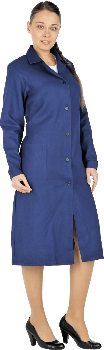 Ткань: Диагональ Состав: 100% хлопок, Основная ткань:Диагональ, пл. 210 г/м² Традиционная модель женского рабочего халата. Халат: • центральная застёжка на пуговицы • три накладных кармана • спинка с хлястиком по линии талии • рукава втачные, с манжетами, застёгивающимися на пуговицы
