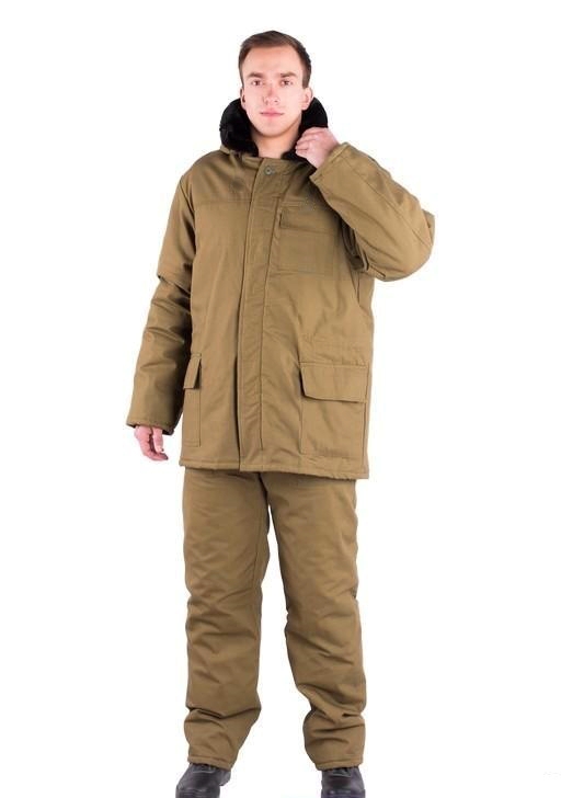 Куртка и брюки. Куртка с супатной застежкой на пуговицы, меховым воротником, отстегивающимся капюшоном, 2 накладными боковыми карманами. Брюки с высоким утепленным поясом, отстегивающимися брителями. Цвет: Хаки Ткань:палаточное полотно Утеплитель : Ватин