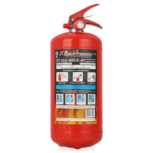 Огнетушитель порошковый (огнетушитель ОП)2кг, 2.1л Являются наиболее универсальными огнетушителями по области применения и по рабочему диапазону температур (особенно с зарядом классов ABCE), с их помощью можно успешно тушить почти все классы пожаров, в том числе и электрооборудование, находящееся под напряжением до 1000 В. Огнетушители не предназначены для тушения загораний щелочных и щелочноземельных металлов и других материалов, горение которых может происходить без доступа воздуха.