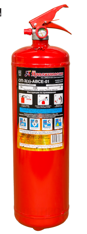 Переносной порошковый огнетушитель ОП-3 для тушения твердых веществ, жидкостей и газов, а также электроустановок под напряжением до 1000В. Вместимость корпуса ОП-3 составляет 3,65 л, масса заряда — 3 кг. Он рассчитан на тушение объекта возгорания в течение 8 секунд при длине струи 2 м.