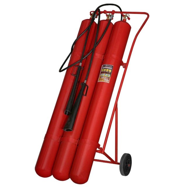 Огнетушитель углекислотный передвижной, вместимость корпуса не менее 3х17.87 л, масса заряда не менее 40 кг, длина струи 4 м, огнетушащая способность 89В, продолжительность подачи не более 210 сек, диапазон рабочих температур -40…+50°С, в комплекте два шланга с раструбом и один смеситель Назначение изделия: Огнетушите углекислотные передвижные предназначены для тушения жидких и газообразных веществ, горение которых не может происходить без доступа воздуха, загораний на транспорте, втом числе и на электрофицированном транспорте , пожаров электрооборудования, находящегося под напряжением не более 10 кВ, пожаров в музеях, картинных галереях, вычислительных центрах и т.д. Марка огнетушителя ОУ-10 ОУ-15 ОУ-20 ОУ-25 ОУ-55 Вместимость корпуса 13,4 2×10,05 2×13,4 2*16,75 3×26 Масса заряда, кг/л 10-0,50 15-0,75 20-1,0 25-1,25 50-2,5 Продолжительность подачи ОТВ, сек 15 15 15 15 20 Длина струи, м 4 4 4 4 4 Огнетушащая способность по классу В 55B 70B 70B 89B 144B Масса огнетушителя, кг 35,0 50,0 70,0 85,0 240,0 Габаритные размеры (диаметр×высота) 159×990 2×135×1000 2×159×2×950 2×159×1100 3×159×1400
