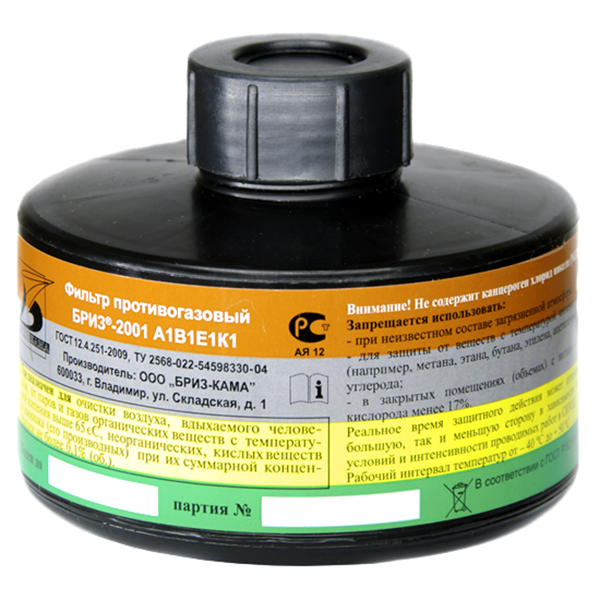 Противогазовый фильтр А2В2Е2К2 предназначен для очистки загрязнённого воздуха от: паров органических веществ с температурой кипения выше 65°С; газов и паров неорганических веществ, кроме оксида углерода; кислых газов и паров; паров амина и аммиака. Корпус фильтра изготовлен из специальной пластмассы и снаряжён поглощающим слоем (шихтой) из сорбента. класс 2. Фильтры размером 113x108 мм и массой до 450 г обладают сопротивлением воздушному потоку (при расходе 30 дм3/мин ) до 140 Па и гарантийных срок хранения 5 лет