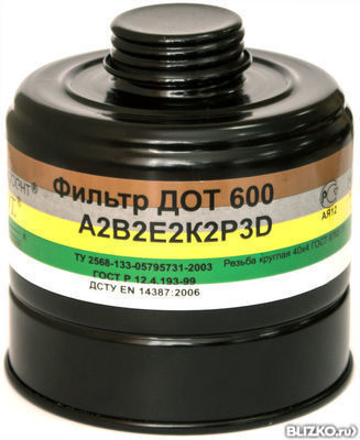 Назначение: универсальный комбинированный противогазовый фильтр среднего габарита (типа ДОТ 600) А2В2Е2К2Р3 защищает от органических газов и паров с температурой кипения выше 65С (бензол, ксилол, толуол, бензин, керосин, галоидоорганические соединения, спирты, анилин, тетраэтилсвинец, сероуглерод, нитросоединения бензола его гомологов и др.), неорганических газов и паров (кроме оксида углерода: хлор, фтор, бром, сероводород, хлорциан; кислые газы и пары: диоксид серы, кислоты муравьиная, уксусная, азотная, серная и др.); кислых газов и паров (диоксид серы, кислоты муравьиная, уксусная, азотная, серная и др.), аммиака и его органических производных и аэрозолей (пыль, дым, туман) Буква Р, присутствующая в обозначении марки фильтра, свидетельствует о соответствии фильтра требованиям ГОСТ 12.4.193-99 по устойчивости к запылению.
