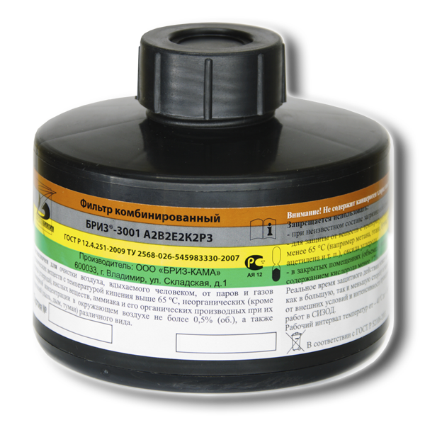 Фильтр противогазовый "Бриз-3001" А2В2Е2Р3 Фильтр комбинированный Бриз-3001 А2В2Е2Р3 предназначен для очистки загрязнённого воздуха от аэрозольных частиц малотоксичных веществ, содержащихся в пыли, дыме или тумане, а также от паров органических веществ с температурой кипения выше +65°С, неорганических газов и паров (кроме оксида углерода), кислых газов и паров. Корпус фильтра изготовлен из специальной пластмассы. Соединительная резьба соответствует ГОСТ Р 12.4.214-99 (40х3,5 мм). Фильтр комбинированный Бриз-3001 А2В2Е2Р3D используется в составе фильтрующего противогаза с полнолицевой маской. Гарантийный срок хранения -5лет