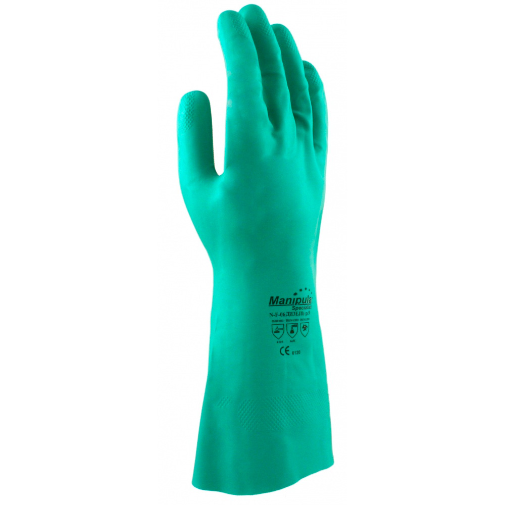 Материал: нитриловый каучук. Внутреннее покрытие: хлопковое напыление. Длина - 320 мм. Толщина - 0.38 мм. Рабочая поверхность - ромбовидная. Манжет: гладкий. Исключительно химически стойкие перчатки для работ с кислотами (концентрация раствора кислоты до 80%), с органическими растворителями, продуктами нефтепереработки (бензин, керосин, масла). Высокая механическая прочность. Маслобензостойкие. Категория риска 3. Применение: нефтяная и химическая промышленность, дерево-металлообработка, механизированные работы, пищевая промышленность. EN 388, EN 420. ГОСТ 12.4.010-75, 12.4.183-91. S,M,L,XL,XXL (12/120)