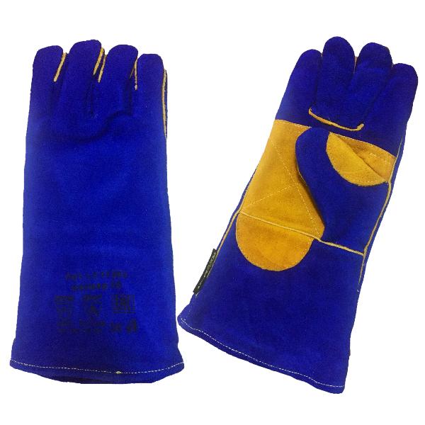 Выполнены из высококачественного синего спилка на подкладке из хлопковой ткани в области манжета и флиса в кистевой части, длина 35 см. На ладони и большом пальце дополнительное усиление из желтого спилка, что увеличивает износоустойчивость и защитные свойства при механических работах и увеличивает защиту от повышенных температур, брызг и расплавленного металла. Наличие мягкой флисовой подкладки повышает комфорт использования, обеспечивает высокую чувствительность и подвижность пальцев. Швы прошиты нитью Кевлар и усилены вставками из кожи