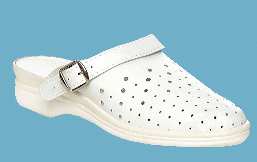 Модель предназначена для работников сферы обслуживания, текстильной, пищевой и легкой промышленности, медицинских работников, обслуживающего персонала. Искусственная перфорированная кожа белого цвета, без задника, с откидывающимся ремешком; литая ПВХ подошва.