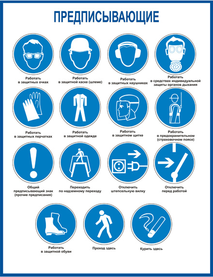 Предписывающие знаки безопасности предназначены для обозначения обязательных действий с целью избежания возможных травм и прочих опасностей Стоимость размера: 200х200мм -15руб(самокл. пленка) 100х100мм -10руб(самокл. пленка) 200х200-180руб(ФОТОЛЮМ ГОСТ самокл. пленка) 200х200-60руб ((ФОТОЛЮМ ТУ самокл. пленка)