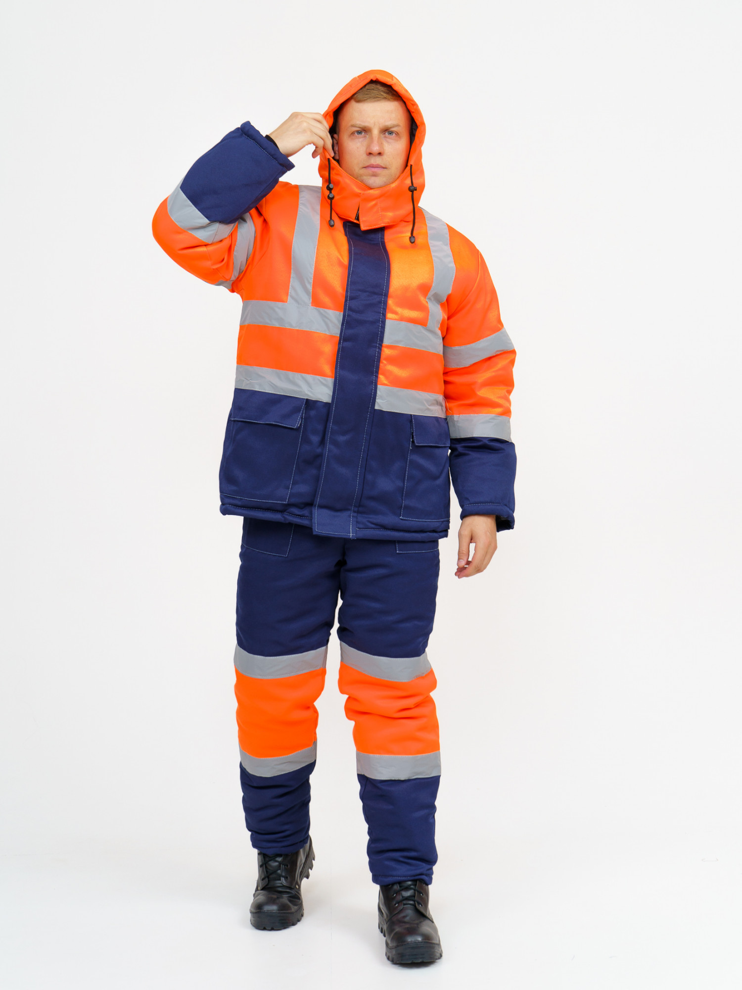 Ткань: смесовая 80% п/э, 20% х/б пл. 200 г/кв.м. Утеплитель: синтепон 3 слоя по 120 г/м Подкладка: нейлон – 100% п/э Цвет: оранжевый с темно-синим Защитные свойства: Ву З Ми Тнв ГОСТ 29335-92 Костюм состоит из куртки и полукомбинезона. Куртка с застежкой на молнию и ветрозащитным клапаном застегивающимся на контактную ленту с двумя нагрудным и двумя боковыми накладными карманами с клапанами. Воротник стойка и утеплённый капюшон, регулирующийся по объему. Полукомбинезон с застежкой на молнию. Рукава с внутренними трикотажными манжетами. Яркая сигнальная ткань оранжевого цвета в сочетании со светоотражающими полосами обеспечивают высокий уровень безопасности проведения дорожных работ.