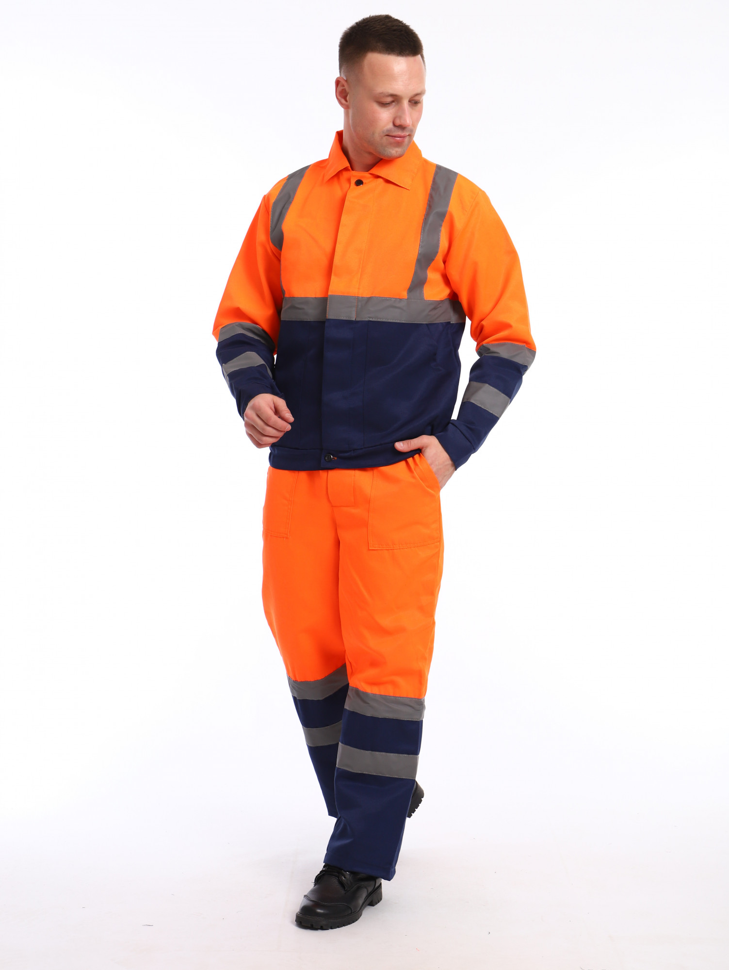 Ткань: Смесовая 80% п/э, 20% х/б пл. 200 г/кв.м. ВО пропитка. ГОСТ 27575–87; ГОСТ P 12.4.219-99 Состоит из куртки и полукомбинезона. Куртка укороченная с притачным поясом, резинками по бокам для регулировки объема, отлажной воротник, центральная супатная застежка на пуговицы, два накладных боковых кармана. Полукомбинезон с боковыми карманами. Световозвращающая лента 5 см.